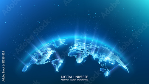 Wall mural map of the planet. rays of energy. world map. global social network. future. vector. blue futuristic