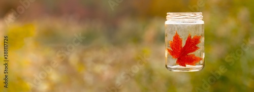 Wall mural maple leaf in a bottle. panoramic view of maple leaf in a bottle on colorful background. signs of au