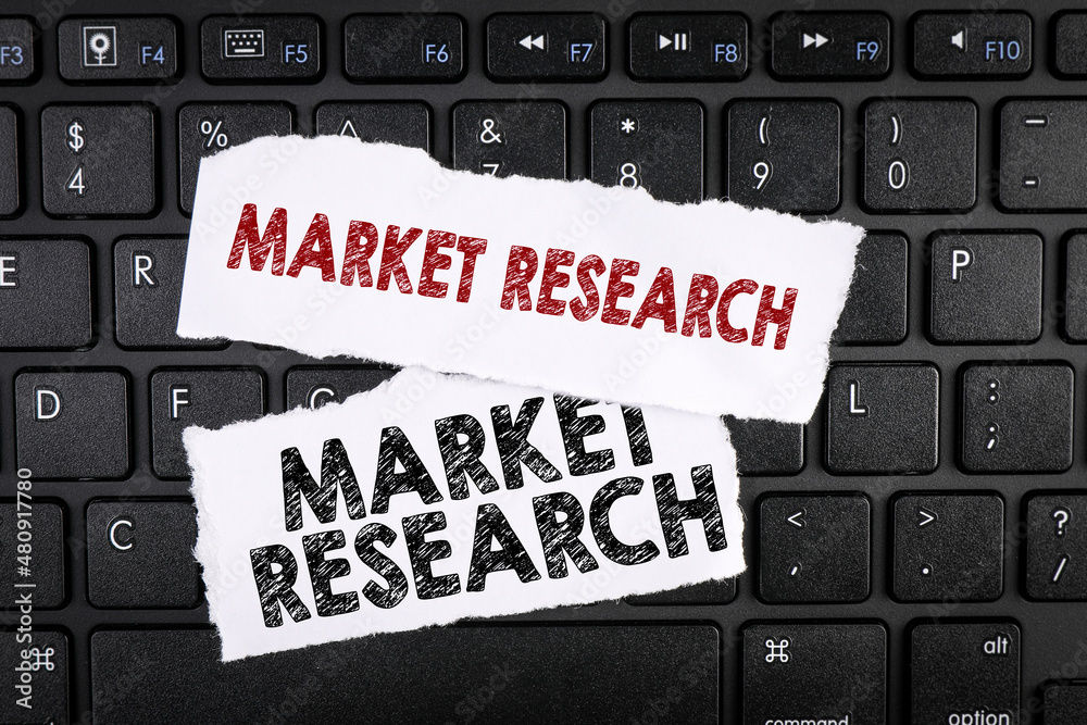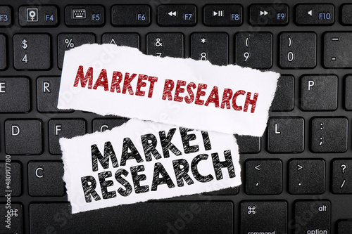 Wall mural : Market research - torn sheets of paper on a black computer keyboard with text