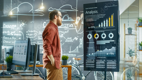 Wall mural : Marketer looks at interactive touchscreen whiteboard showing latest graphs and charts on statistical