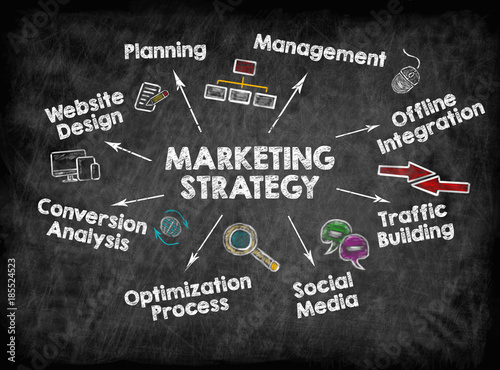 Wall mural marketing strategy concept. chart with keywords and icons. black board with texture, background. - Wall murals Wall mural marketing strategy concept. chart with keywords and icons. black board with texture, background. - Wall murals