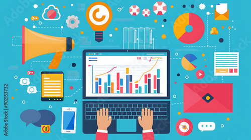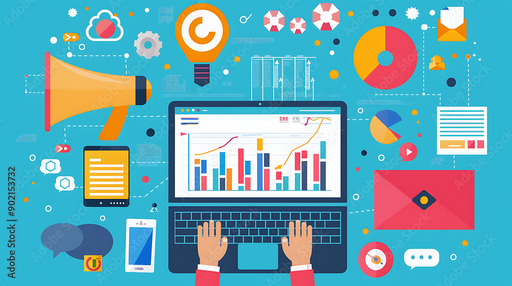 Wall mural marketing strategy concept. chart with keywords and icons. hands on working desk doing business