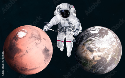 Wall mural mars and earth on background of astronaut. solar system. 3d render. science fiction. elements of thi