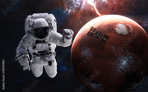 Wall mural mars. astronaut, space station on background of inhabited red planet. solar system. 3d render. scien - Wall murals Wall mural mars. astronaut, space station on background of inhabited red planet. solar system. 3d render. scien - Wall murals