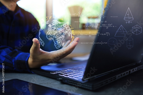 Wall mural : Math and physics equation concept with student hand holding globe with quotations function of geomet
