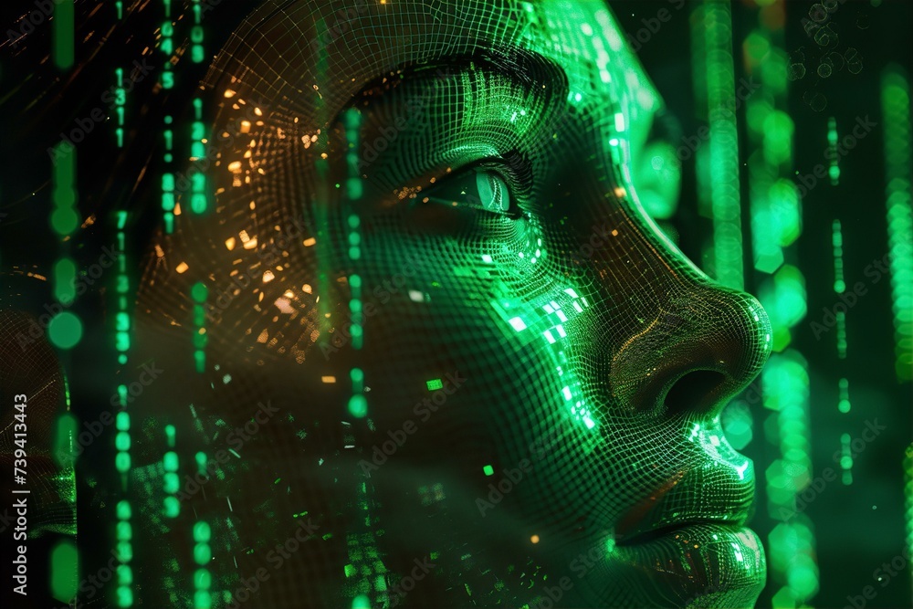 Wall mural matrix human face 3d neon binary code random - Wall murals Wall mural matrix human face 3d neon binary code random - Wall murals