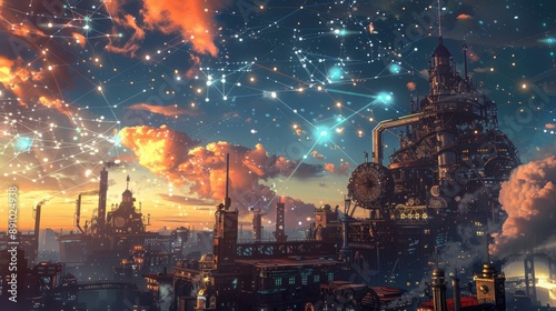 Wall mural mechanical constructs of clockwork and steam clashing in a futuristic cityscape under a sky ablaze w