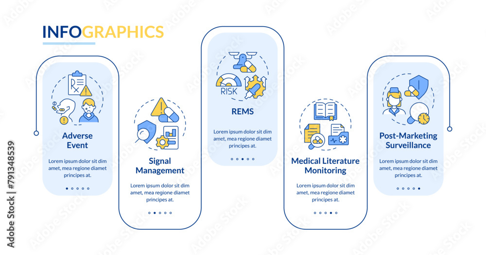 Wall mural : Medical product quality control rectangle infographic template - data visualization with 5 steps - edi