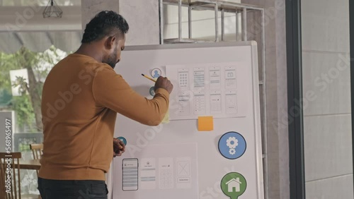 The watermark will not be included on Wall mural.: Medium long shot of indian ux designer working with mobile app mockup sketches and sticky notes flip