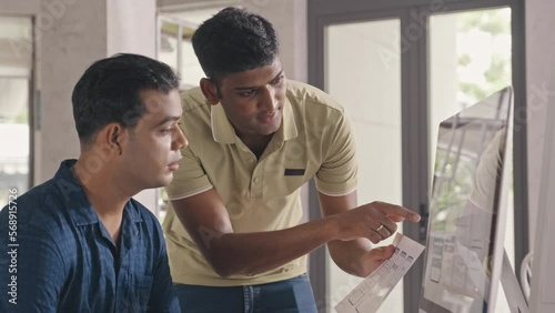 The watermark will not be included on Wall mural.: Medium shot of two indian ux designers discussing mobile app wireframe sketch on paper and computer
