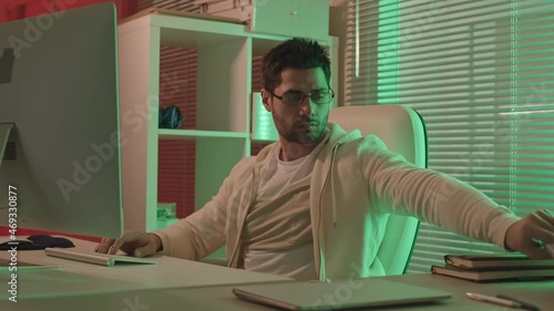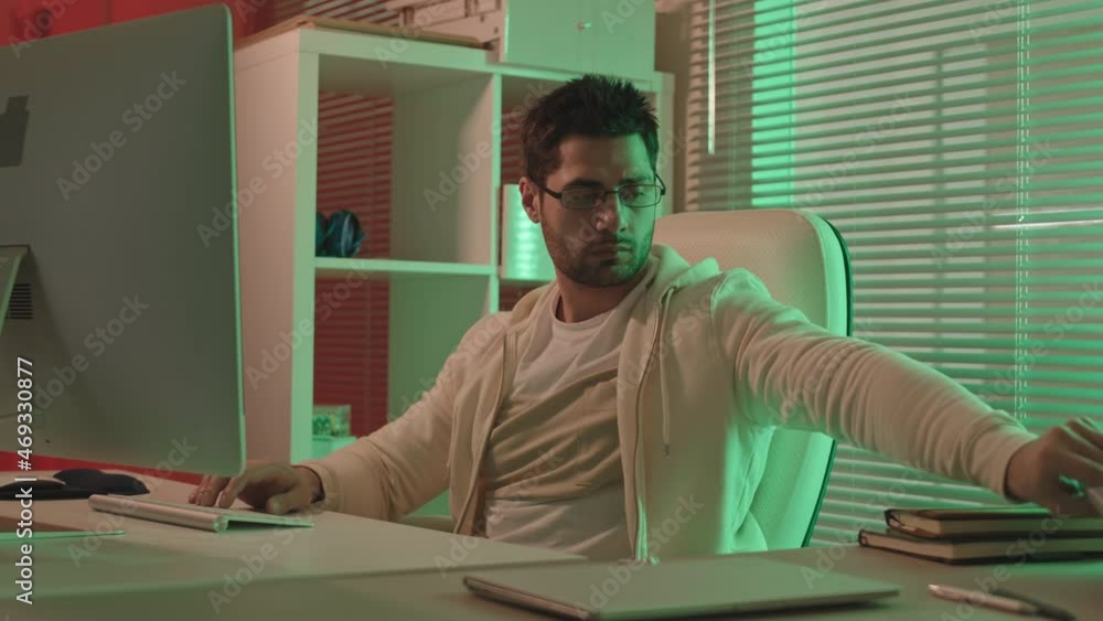 Medium slowmo shot of serious bearded programmer in casualwear and eyeglasses working on pc computerWall mural