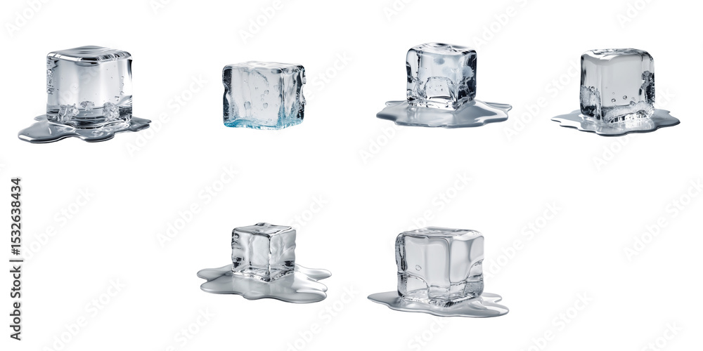 Wall mural melting ice cubes on a transparent background showing various stages of melting with water puddles s - Wall murals Wall mural melting ice cubes on a transparent background showing various stages of melting with water puddles s - Wall murals