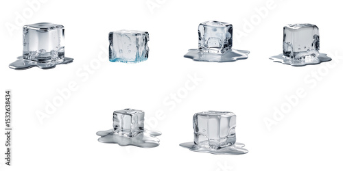 Wall mural melting ice cubes on a transparent background showing various stages of melting with water puddles s