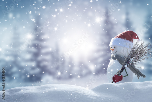 Wall mural merry christmas and happy new year greeting card with copy-space.happy snowman standing in christmas