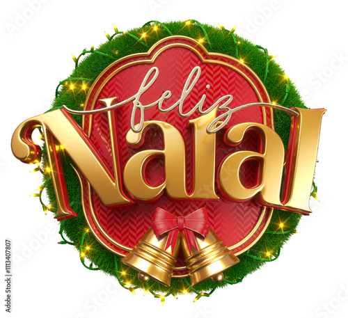 The watermark will not be included on Wall mural.: Merry christmas in brazilian portuguese label garland red and gold in 3d render with background tran