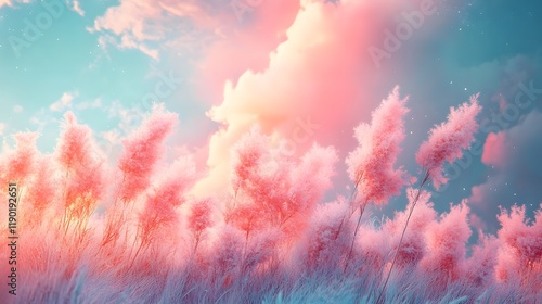 The watermark will not be included on Wall mural.: Mesmerizing pastel gradient landscape with soft fluffy textures and a whimsical fantasy inspired cha