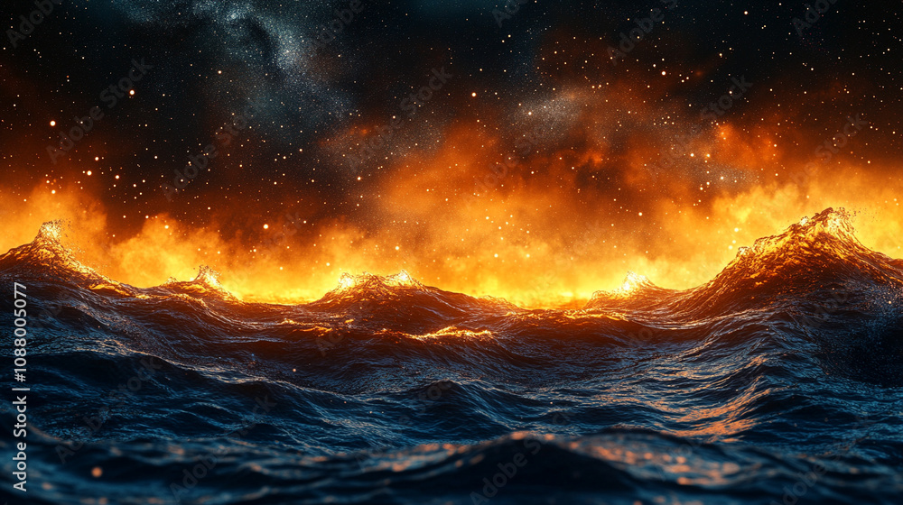 The watermark will not be included on Wall mural.: Mesmerizing view of ocean waves gently rolling under a starry night sky, with a dreamy blurred backg