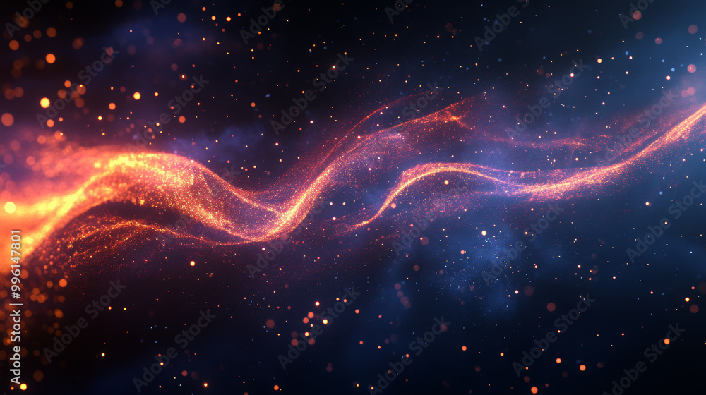 The watermark will not be included on Wall mural.: Mesmerizing wave of glowing particles dances against dark background, creating stunning visual effec