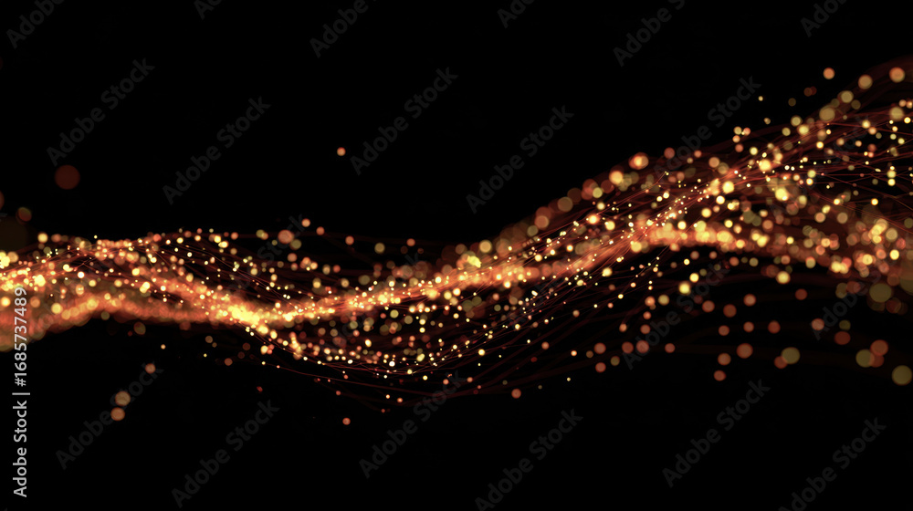 The watermark will not be included on Wall mural.: Mesmerizing wave of golden particles flows gracefully against dark background, creating sense of mov