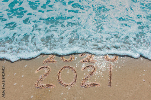 Wall mural message year 2020 replaced by 2021 written on beach sand background. good bye 2020 hello to 2021 hap