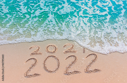 Wall mural message year 2021 replaced by 2022 written on beach sand background. good bye 2021 hello to 2022 hap