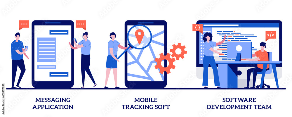 Messaging application, mobile tracking soft, software development team concept with tiny people - smaWall mural