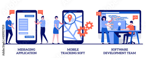 The watermark will not be included on Wall mural.: Messaging application, mobile tracking soft, software development team concept with tiny people - sma
