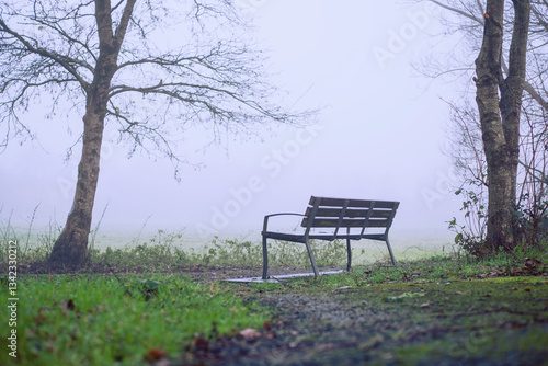 The watermark will not be included on Wall mural.: Metal bench in a park next to a field which is covered with fog and mist - moody calm nature scene -