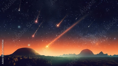 Wall mural : Meteor shower in the night sky over the silhouettes of mountains against the backdrop of sunset -