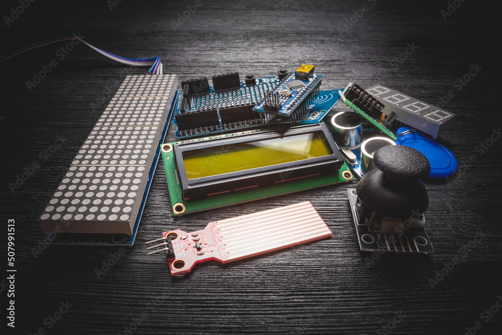 The watermark will not be included on Wall mural.: Microprocessor programming parts on the black table concept background -