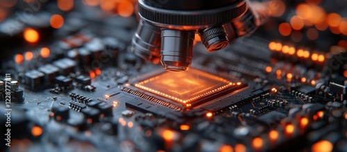 The watermark will not be included on Wall mural.: Microscope inspecting illuminated microchip on circuit board -