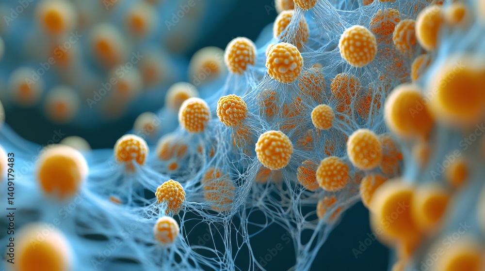 Wall mural microscopic orange cells network detailed 3d render abstract background web art image macro design