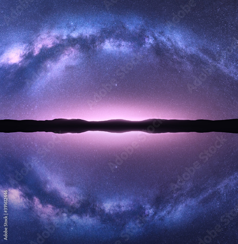 Wall mural milky way arch reflected in water. night landscape with bright arched milky way, purple sky with sta
