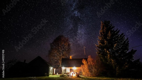 The watermark will not be included on Wall mural.: Milky way timelapse with stars in clear summer night - old barn house - country side - timelapse footag