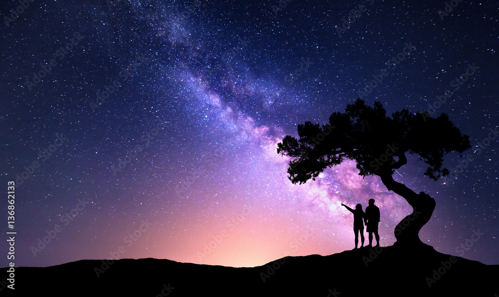 Wall mural : Milky way with people under the tree on the hill - landscape with night starry sky and silhouette of