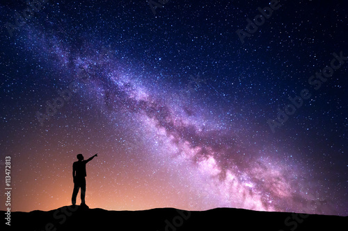 Wall mural : Milky way with silhouette of a standing man pointing finger in night starry sky on the hill - colorfu