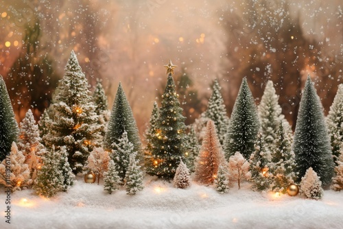 Wall mural miniature christmas trees covered in snow creating a festive scene with golden lights and ornaments