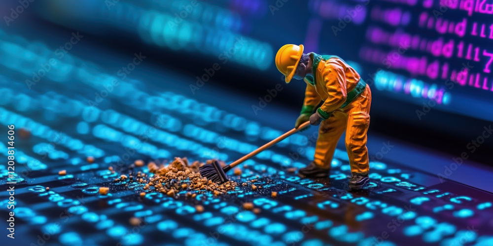 The watermark will not be included on Wall mural.: Miniature developer cleaning digital data on glowing computer screen