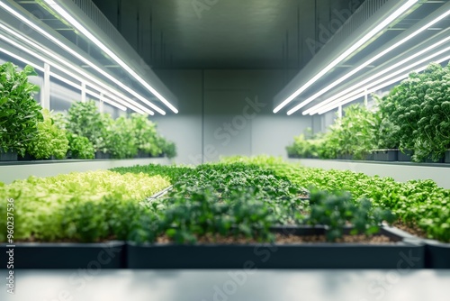 Wall mural : Minimal ai-controlled vertical farming setup indoors, soft natural light, large empty space for text