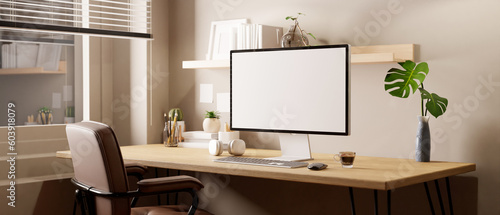 The watermark will not be included on Wall mural.: Minimal bright working space in apartment with computer mockup and decor