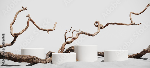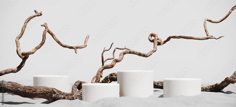 Wall mural : Minimal mockup background for product presentation - podium and dry tree twigs branch with white sand