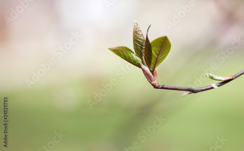 Minimal springtime background - beautiful red bud spring tree branch with fresh green leaves - shallowWall mural