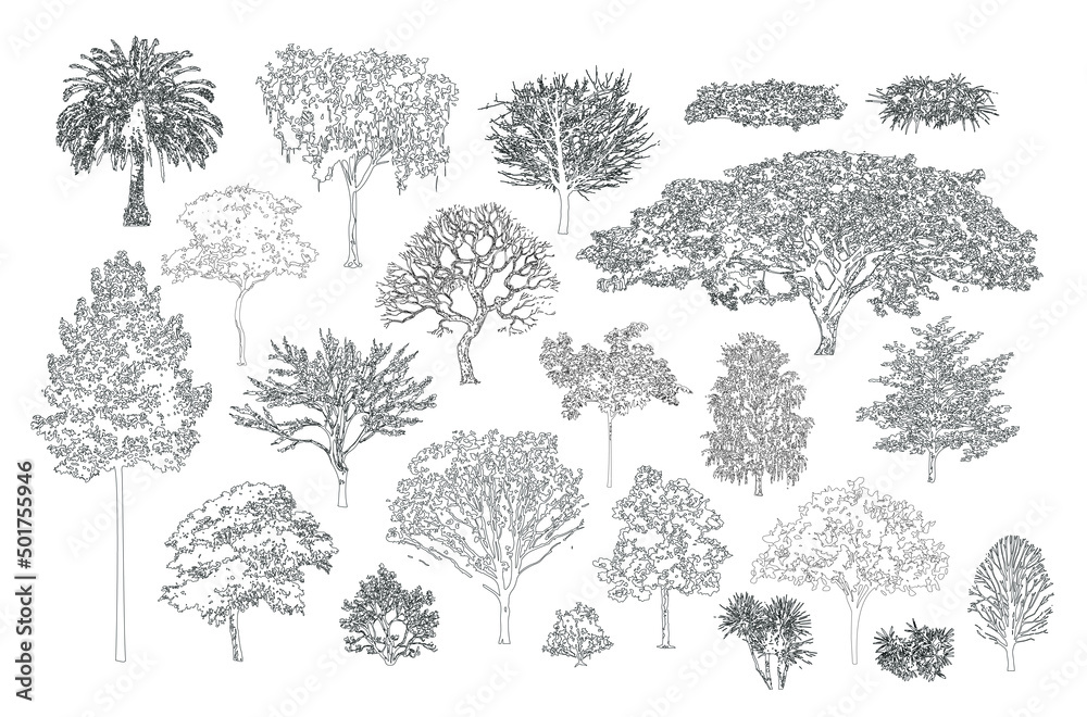 Minimal style cad tree line, side view, set of graphics trees elements outline symbol for architectuWall mural