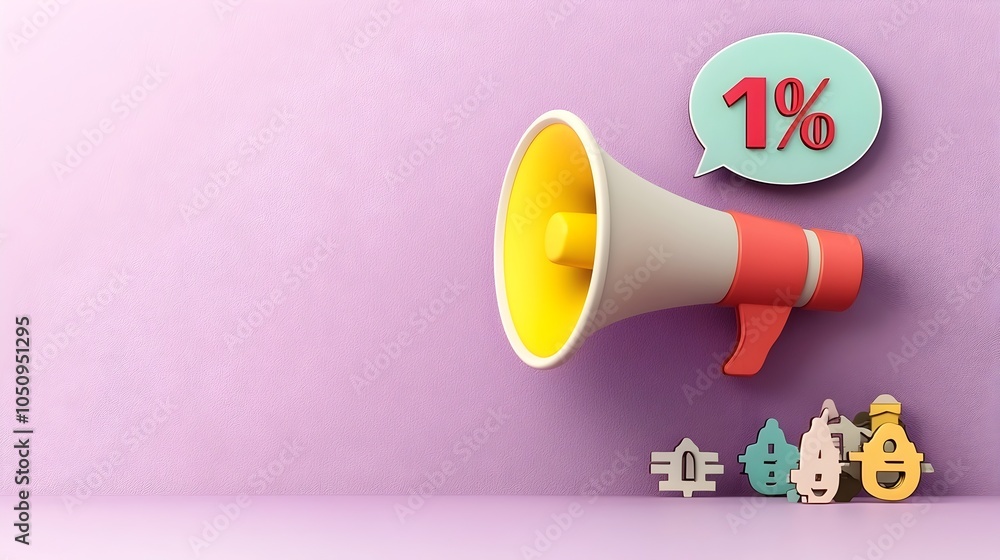 The watermark will not be included on Wall mural.: Minimalist 3d design of a megaphone with a speech bubble and percent symbol hovering on a solid purp