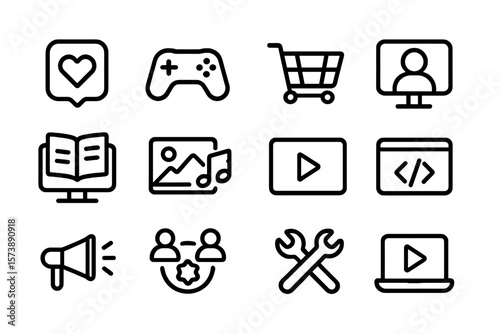 The watermark will not be included on Wall mural.: Minimalist black line icons set for digital media and user interface design