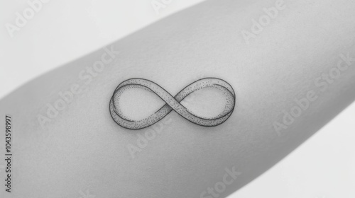 The watermark will not be included on Wall mural.: Minimalist black line tattoo of an infinity symbol, sleek and detailed on a bright white background -