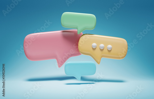 Wall mural : Minimalist blue red and yellow speech bubbles talk icons floating over background - modern conversati