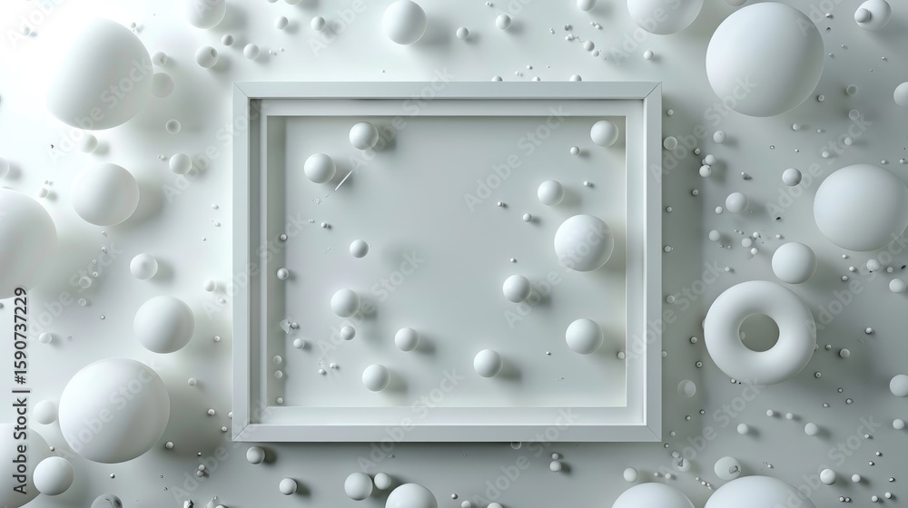 The watermark will not be included on Wall mural.: Minimalist design with geometric spheres surrounding a crisp rectangular white frame in center