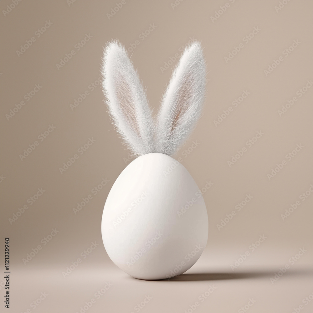 The watermark will not be included on Wall mural.: Minimalist easter greeting card - white egg with fluffy bunny ears isolated on solid background