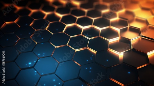 The watermark will not be included on Wall mural.: Minimalist hexagonal elements arranged in a honeycomb pattern, glowing softly, on a dark tech-inspir
